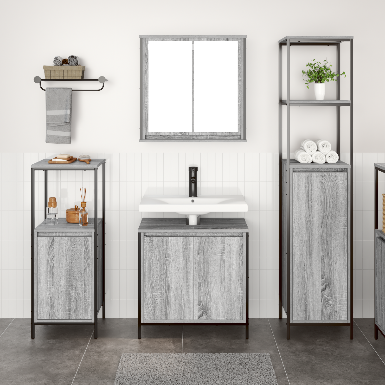 Hev stilen og funksjonen på badet med dette 3-delte møbelsettet, designet for både organisering og estetikk. Den stilige grå sonoma-finishen gir et moderne preg som passer til mange interiørstiler, samtidig som det tilbyr rikelig med lagringsplass så badet holder seg ryddig og effektivt.
