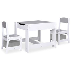 Dette settet er laget av MDF-paneler med forsiktig avrundede hjørner, som er solide og beskytter barn mot skader fra skarpe hjørner og kanter. Det multifunksjonelle bordet har en avtagbar tosidig bordplate. Den ene siden er en whiteboard-tavle og den andre siden er en krittavle. Det inkluderer et innfelt lekeområde og et oppbevaringsrom, som er perfekt for barna å spise, leke og lagre leker, og forhindrer at leker, drikkevarer og snacks kommer fra bordet.