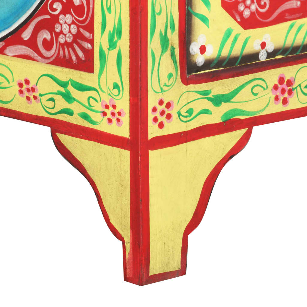 Dette vakre nattbordet i tre er utsmykket med rike, håndmalte dekorasjoner. Det er et iøynefallende tilbehør til soverommet med sitt fargerike design.
